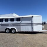 railer measures 8’wide x 7’tall x 22′ on the floor. Trailer features extended tounge, electric jack, combo lock on tack door, extra large dressing room, insulated roof, roof vent, walk through door into horse area, escape door with slider window, 3 drops with safety bars, alcoa wheels and good tires, hay rack w/ 2 water tanks. Horse area has poured in rubber floor, stud divider, roof vents, padded stalls, feed bags, interior lites, bus windows on hip side, collapsible rear tack, 4-teir saddle tree, bridle hooks, brush tray, full length awning, load lites and comes with 10- 6′ aluminum panels. This is a great little trailer and will not last long!!!!!